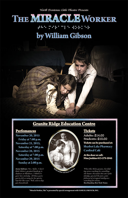THE MIRACLE WORKER is a play based on the true story of Helen Keller who became blind and deaf before she was two. It's also the story of Annie Sullivan, her teacher, who struggled with her own blindness and with the memories of growing up in an orphanage. Part of their story is the conflict of the North vs. South values of the American Civil War, and the cultural milieu that "everyone had their place." As a Captain in the war, Keller was used to strict discipline. But as head of the house-hold, hes unable to control the young Helen. She's rough and tumble, eats with her hands and has daily tantrums. Then along comes Annie. She is determined to make good at her first position. She recognizes that Helen's mind works perfectly well in spite of losing her senses. However, Annies grim past threatens to undermine her. Kate Keller is fiercely loving and wants to keep her family together. James Keller (Jimmie) is resigned to Helen's dominance in the family life, while searching for his own place after the death of his mother. Aunt Ev is torn between being a supporter of both Keller's sense of propriety and Kate's determination to get help for Helen.