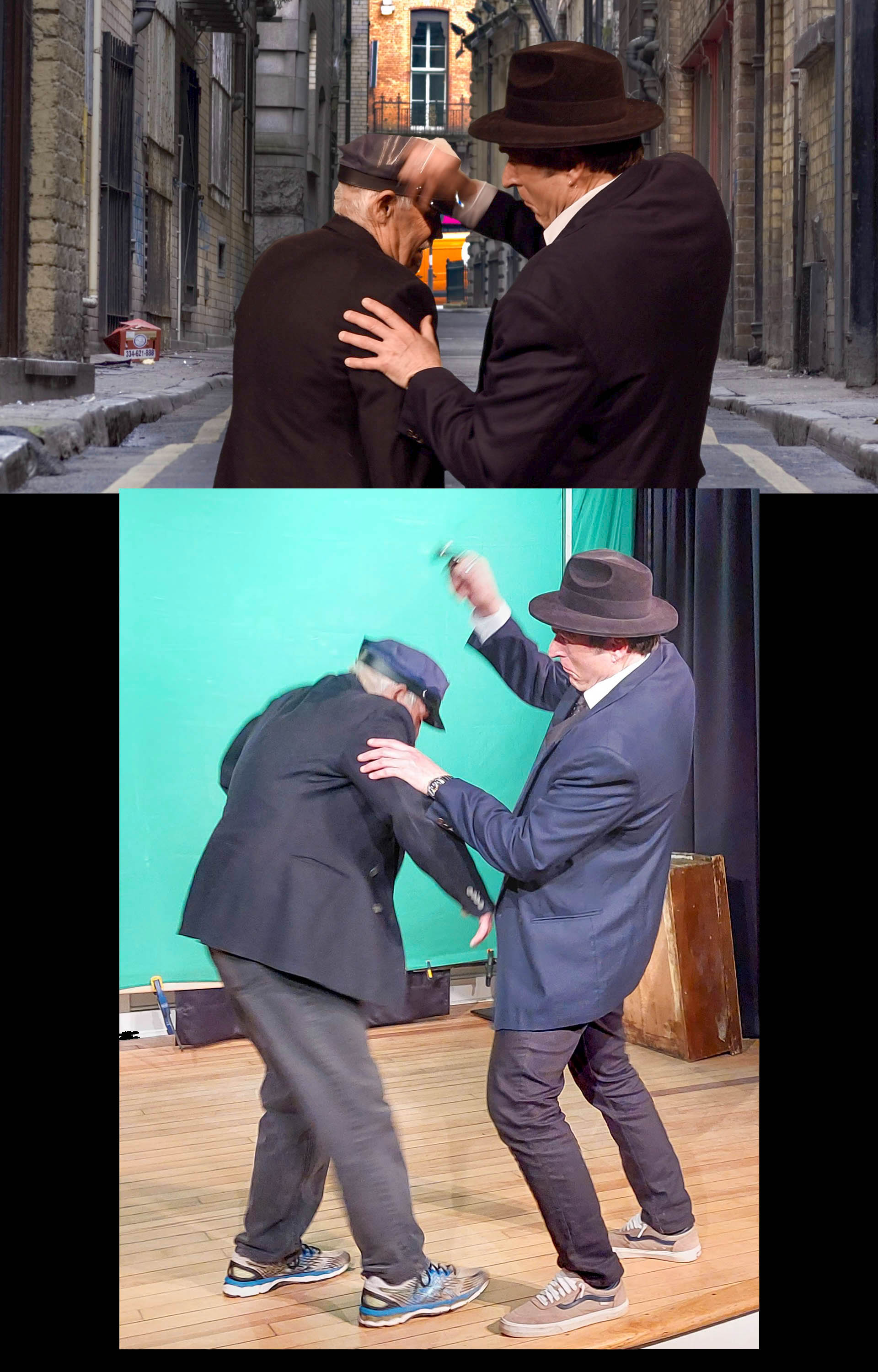 Rufus Blake used the chromo, green screen video recording system. With specialized video editing software, any image or video can be substituted for the green background.